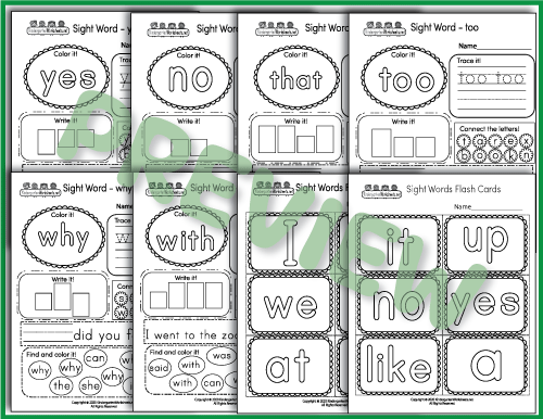 This set of kindergarten worksheets features 100 sight words! Additionally, there are 17 pages of printable flash cards containing all 100 sight words.